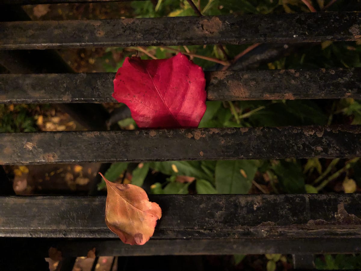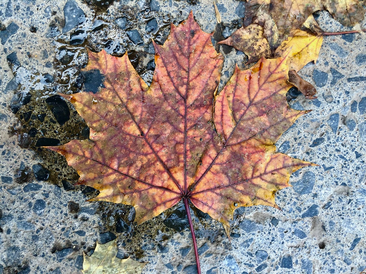 A few days later, another leaf seemed to want to melt into the cement of the pavement. Geometrically as beautiful as the first one, humbly closer to what we all are, veins and blood of passage.