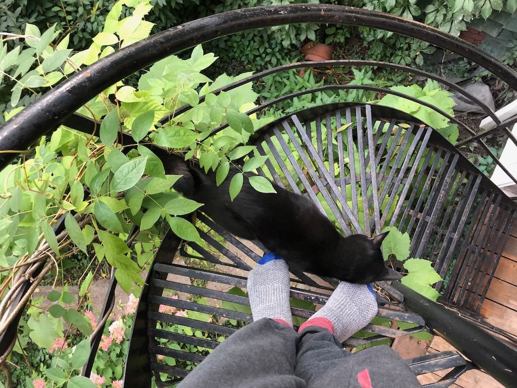 The cat remains officially wandering. He gravitates around the house, sleeps in the house, wakes Yves up at 4:30 am because he’s hungry, lies on the couple’s bed. He is at home.