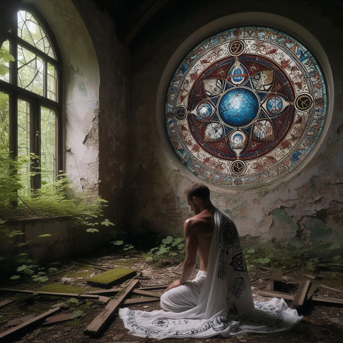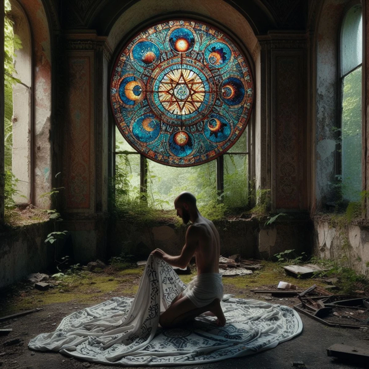 I asked both DALL-E (offered free by Bing, so no accurate control) and Midjourney (paid package) to describe a man, one knee on the ground, draped in a veil with symbols inscribed. The man must have stood before a stained-glass window depicting astronomical figures in a ruined temple.