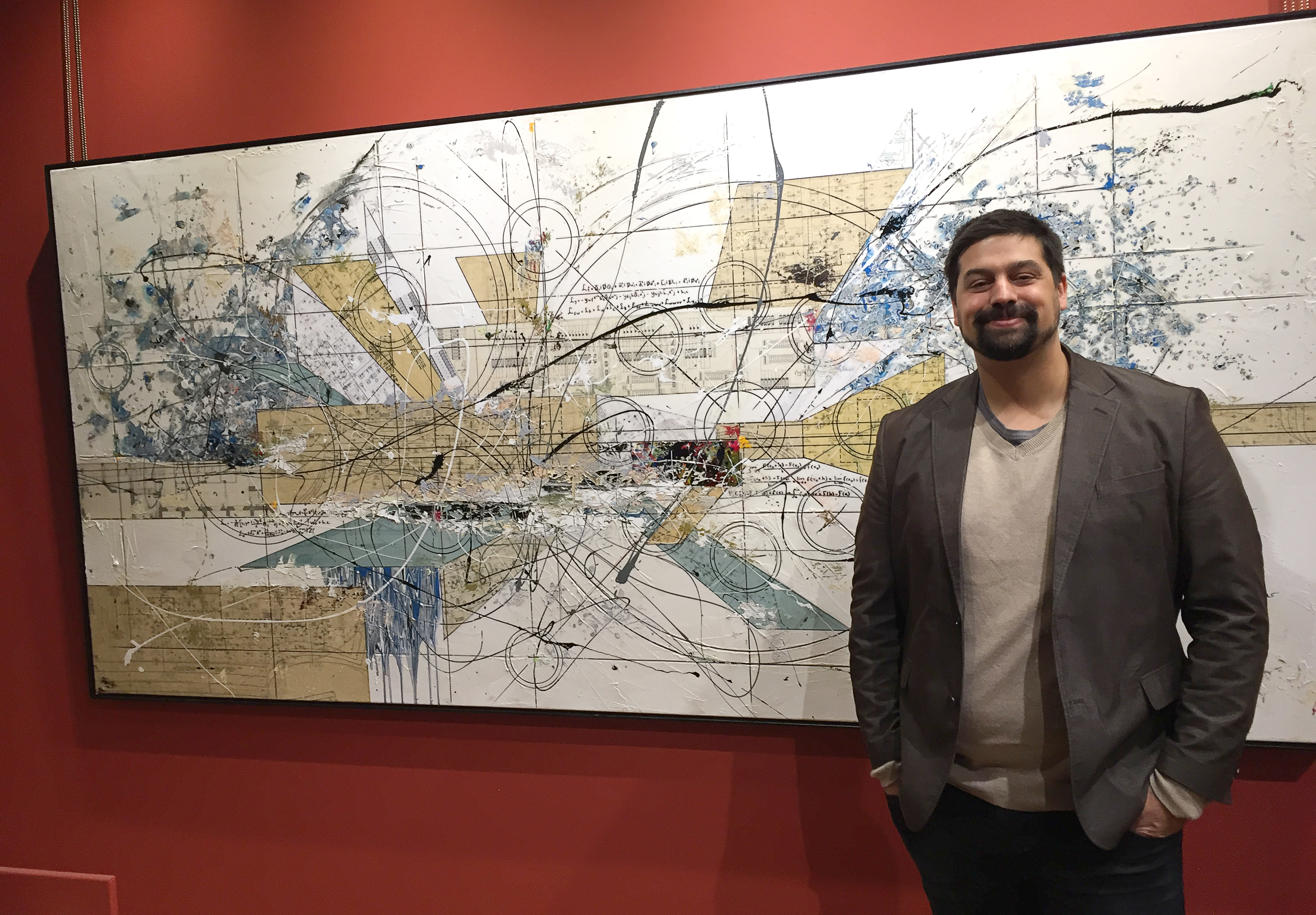 Étienne Gélinas’ work is a clever but never obtuse amalgam of architectural plans, acrylic textures that blur the cards, Leonardian drawings.