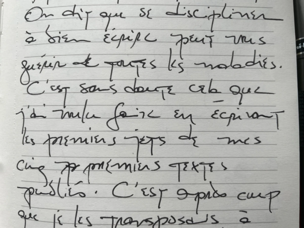 They say that disciplining yourself to write well can cure or protect you from all illnesses. I probably wanted this when I wrote the first drafts of my first five published texts. Afterwards, I transposed them to the computer. I would have to speak of six texts because the first one, Le Triomphe des Eaux, was a long litany of outpourings following a short but incisive first love horror story.