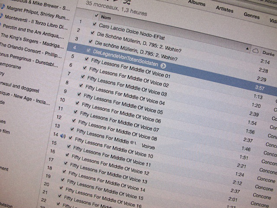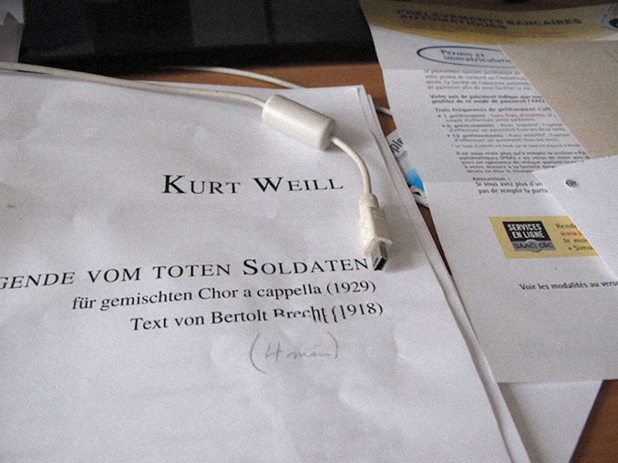 L’après-midi reçoit sa neige. Mon bureau est à l’envers, puisqu’il est mort, doucereusement immobile. Je me suis égosillé sur *Die Legende vom Toten Soldate*n (La légende du soldat mort), puis ai laissé filer l’accompagnement de mes Concone. Comparées au Weill, ces mélodies ont le goût d’un sucre bourgeois qui s’entendrait bien dans les étables, en compagnie de Mozart.