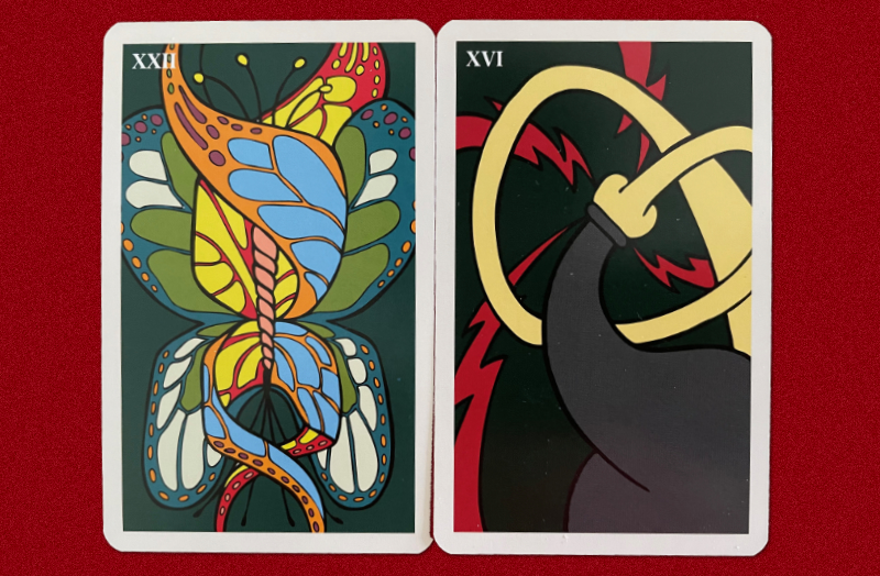 Pour carte la carte B, j’ai choisi la XVIe, la Tour dans le Tarot traditionnel, *Tabula Rasa* dans Intùiti. Page 84. *C’est la véritable perturbation. Nous connaissons maintenant nos vérités et nous les vivons. La question est : «Qu’est-ce que je ne dis pas à voix haute ? Pourquoi ne le dis-je pas ? Quelles en seraient les conséquences ? Est-ce que ce serait vraiment si terrible ? … L’archétype invite à embrasser la chute : faire la fête après avoir été licencié, ressentir l’explosion de la vie en spirale, se réjouir de la volonté de se relever et de recommencer. Si nous nous sommes débarrassés d’une certaine situation, cela signifie qu’elle n’était pas faite pour nous, réjouissons-nous ! … Dites la vérité. Démontez tout si c’est nécessaire.»*