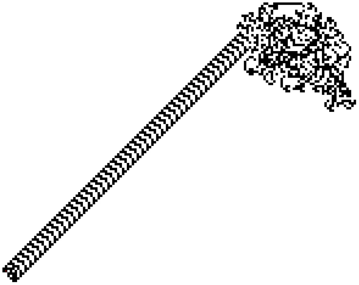 Comme on s’en doute, la fourmi va, au départ, dans tous les sens, mais au bout de la 10000e itération (changement de case), elle se met à aller tout droit dans ce que le Langton a appelé une autoroute.