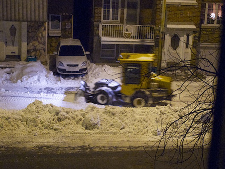 Les gens vivent leur hiver. Le premier grand souffle est passé et a laissé neige, pluie verglaçante, enfin, un grand froid qui a lavé le ciel pendant deux jours. J’ai vécu en partie ces remous saisonniers cloué au lit, pour ensuite me relever et travailler dans la maison. J’ai eu beaucoup de difficulté à m’endormir ces derniers jours, tant à cause du rhume que pour des raisons bénignes et diverses. Pendant deux nuits, les déneigeurs de la Ville ont pris, me semble-t-il, une éternité à racler devant ma porte, précédés des klaxons militaires des remorqueurs avertissant les automobilistes récalcitrants de déguerpir avant d’être remorqués.