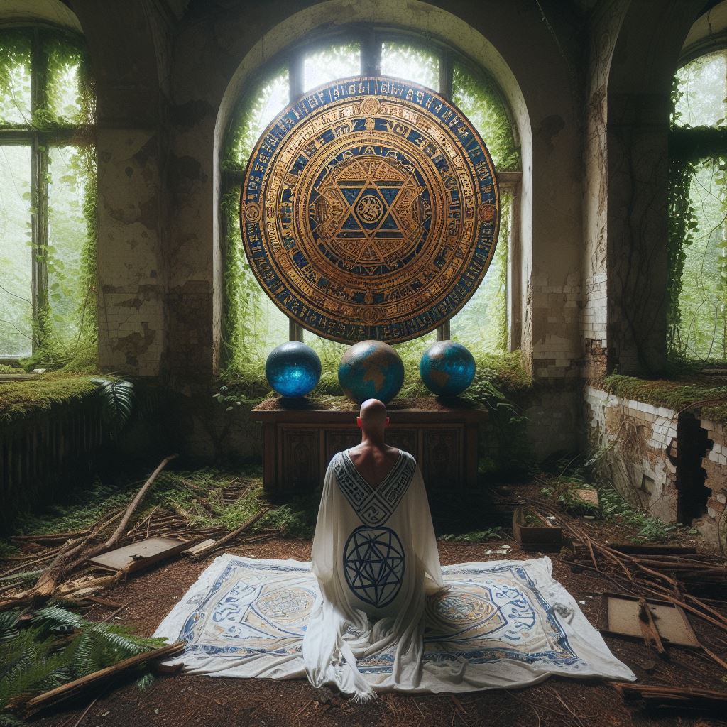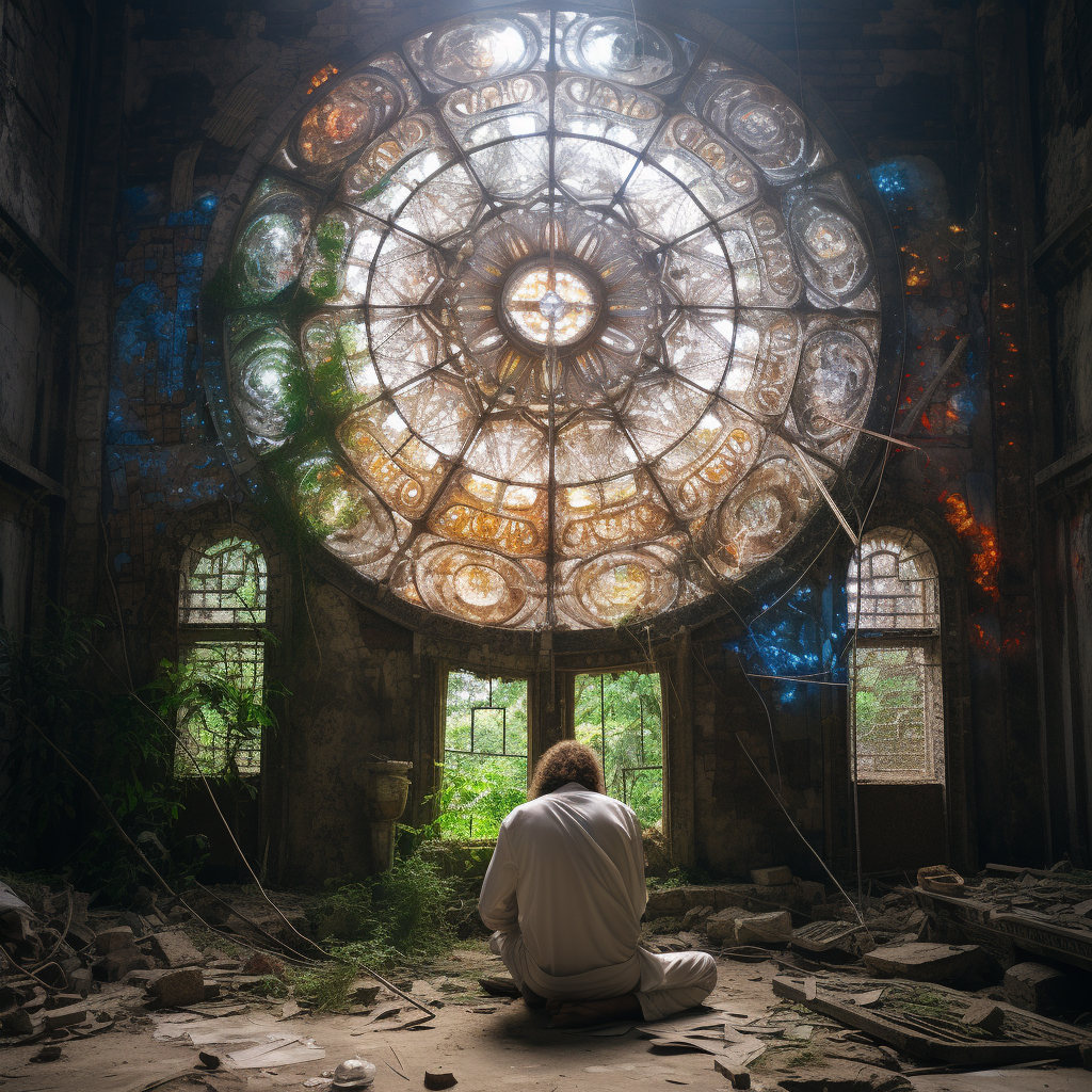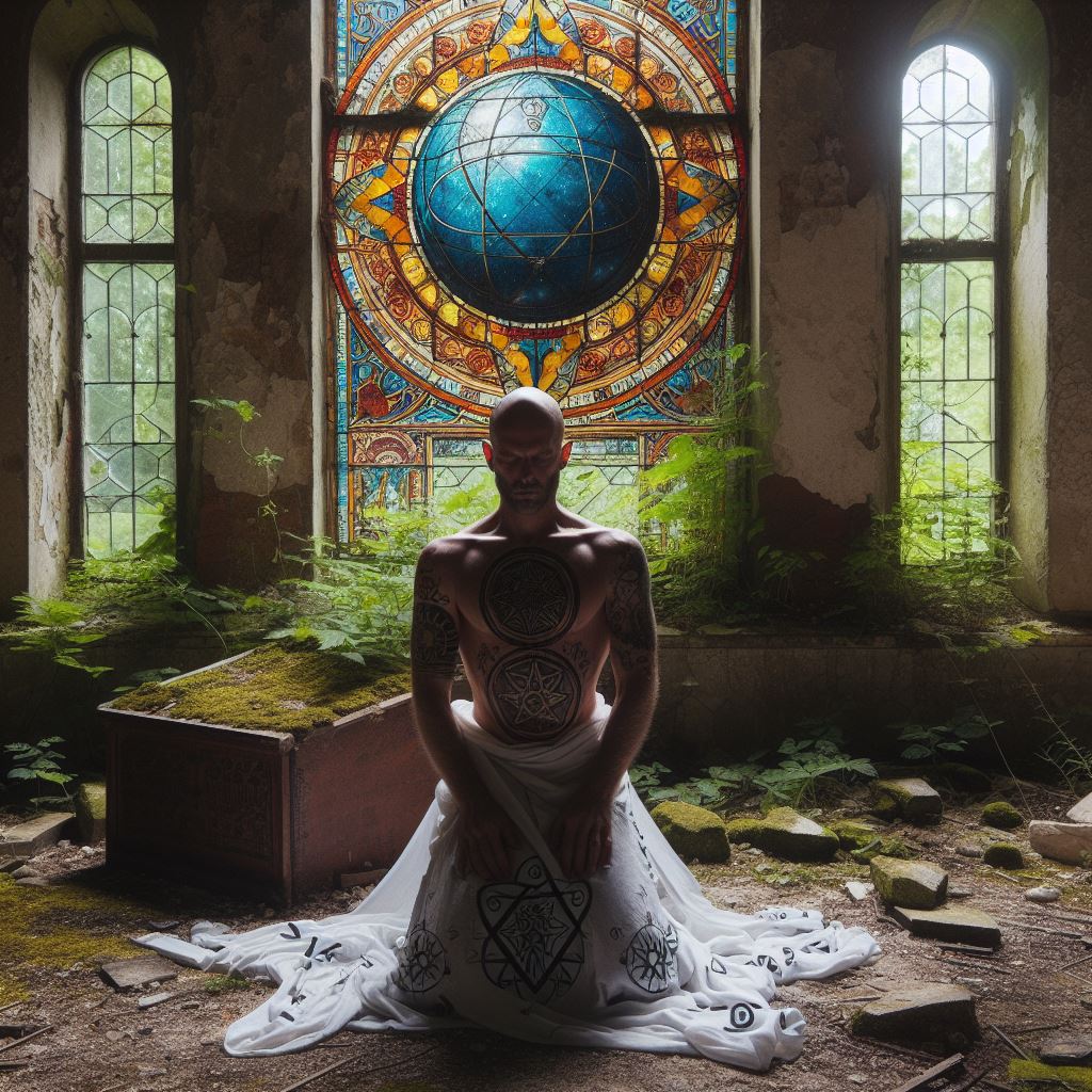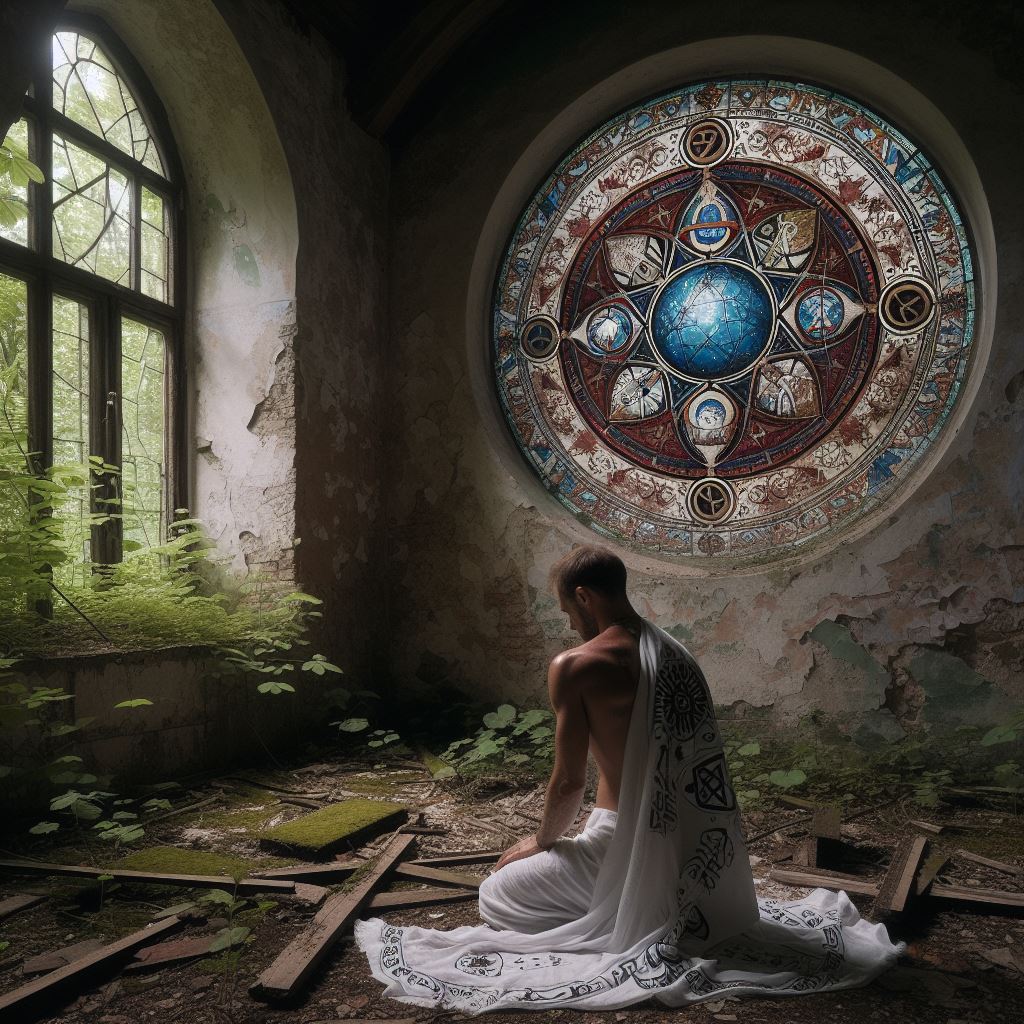 J’ai demandé autant à DALL•E (offert gratuitement par Bing, donc sans véritable contrôle) et à Midjourney (forfait payant) de me décrire un homme, un genou par terre, drapé d’un voile sur lequel sont inscrits des symboles. L’homme devait être devant un vitrail reproduisant des figures astronomiques dans un temple en ruine.