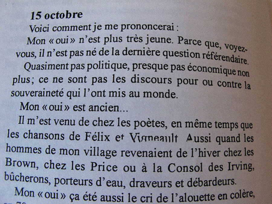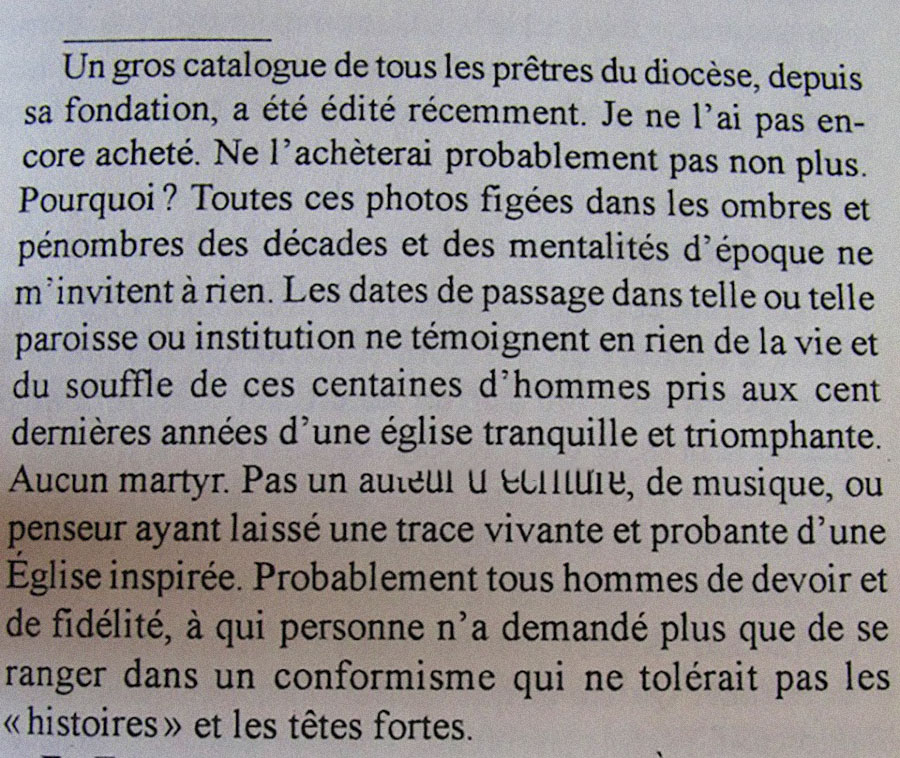 Je crois que le prêtre en question avait eu une vie tourmentée, luttant contre certains démons éthyliques. Toujours est-il que j’ai relu des passages. Les écrits datent de 1995, en pleine campagne référendaire. Si des passages peuvent être passés sous silence, certains autres sont magnifiquement bien ourlés (D’une rencontre avec des anciens confrères ordonnés en même temps que lui : *sept de mes confrères sont « éteints ». Comme pétrifiés, ne montrant aucune plaie saignante, muets de Parole, interdits d’avenir et incapables de culpabilité.* Et plus loin, concernant une cérémonie de baptême tenue en même temps que la fameuse marche des femmes sur Québec, en 1995 : *Le « gros baptême » que je célébrais en matinée m’a paru une contradiction à ce slogan « Du pain et des roses ». Une centaine d’invités, sous la coupe d’une volonté visiblement matriarcale, ont paradé à travers tous les « gadgets », balounes, vidéo, réceptions et toilettes commandées par la surconsommation*.)