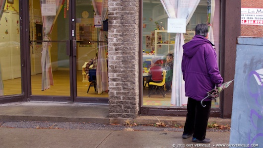Cette dernière photo a attiré mon regard. Au centre, le jeune homme flouté d’hier. Il y a de ces curieux hasards. Bien que je me sois promené à peu près aux mêmes heures, cette photo, tout comme celle d’hier, fut prise spontanément sans étudier au préalable les sujets de la photographie.