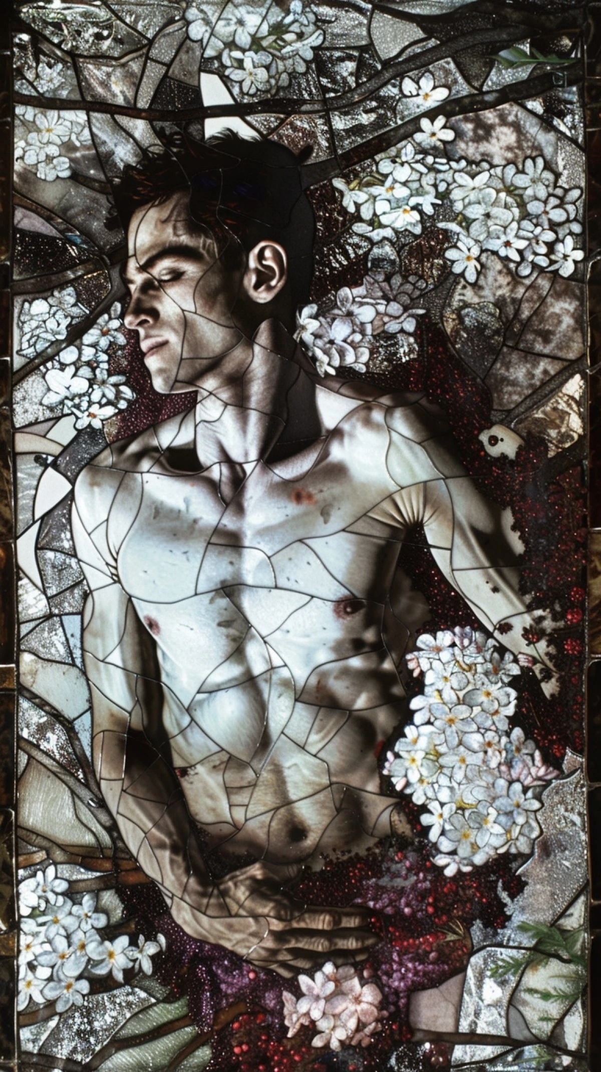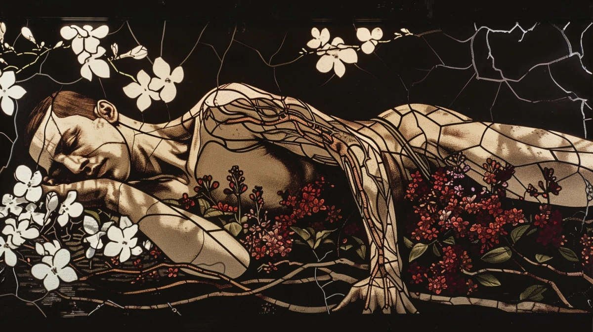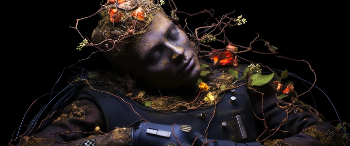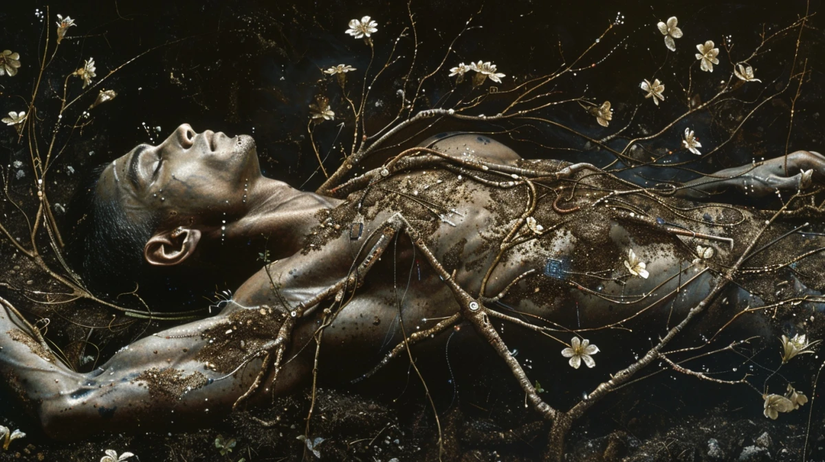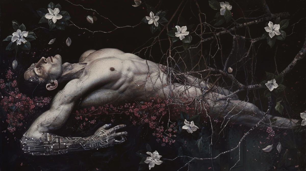Mes yeux me rendent muets, s'abreuvent de fleurs et de natures mortes. «Un homme allongé, torse nu, électronique incrustée dans la peau, sol et racines, branches et fleurs, ciel sombre» fut ma première commande aux lointains algorithmes. Puis j'ai demandé des altérations, des variations, j'ai laissé courir ma pensée, mon intuition, même si j'ai peu de contrôle du résultat obtenu.