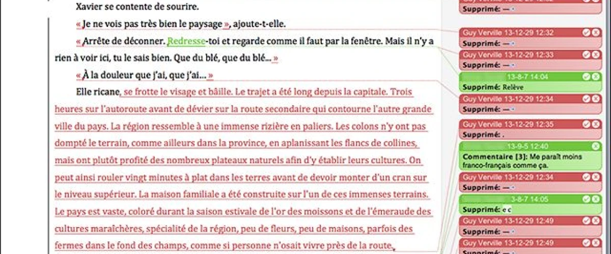 J’ai donc repris le texte, tel que partiellement annoté par l’éditrice avant qu’elle ne s’arrête et me le remette afin que je revoie « l’oralité de mes personnages », à savoir le niveau de langage parfois un peu trop emprunté. Elle aimerait également que je décrive davantage les lieux, que je mette moins l’emphase en quelque sorte sur la théâtralité pour en revenir à une douceur plus littéraire.