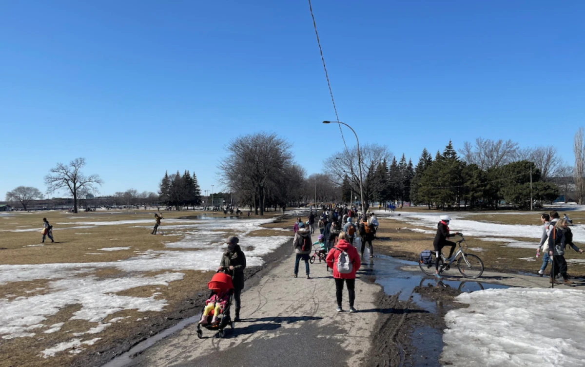 Il y avait beaucoup de monde un peu partout, au point de sentir tout de même le danger de la contagion qui rôde encore autour de nous. Les gens ne semblaient pas préoccupés outre mesure, assis les uns contre les autres sur tout ce qui pouvait servir de banc sec. Nombre d’enfants n’avaient même pas de manteau, bouillonnant de vie comme jamais, comme lorsqu’on a enfin le droit d’aller dehors sans porter un quelconque scaphandre fait maison.
