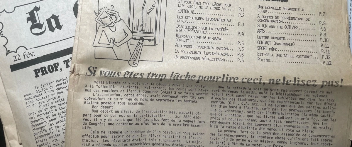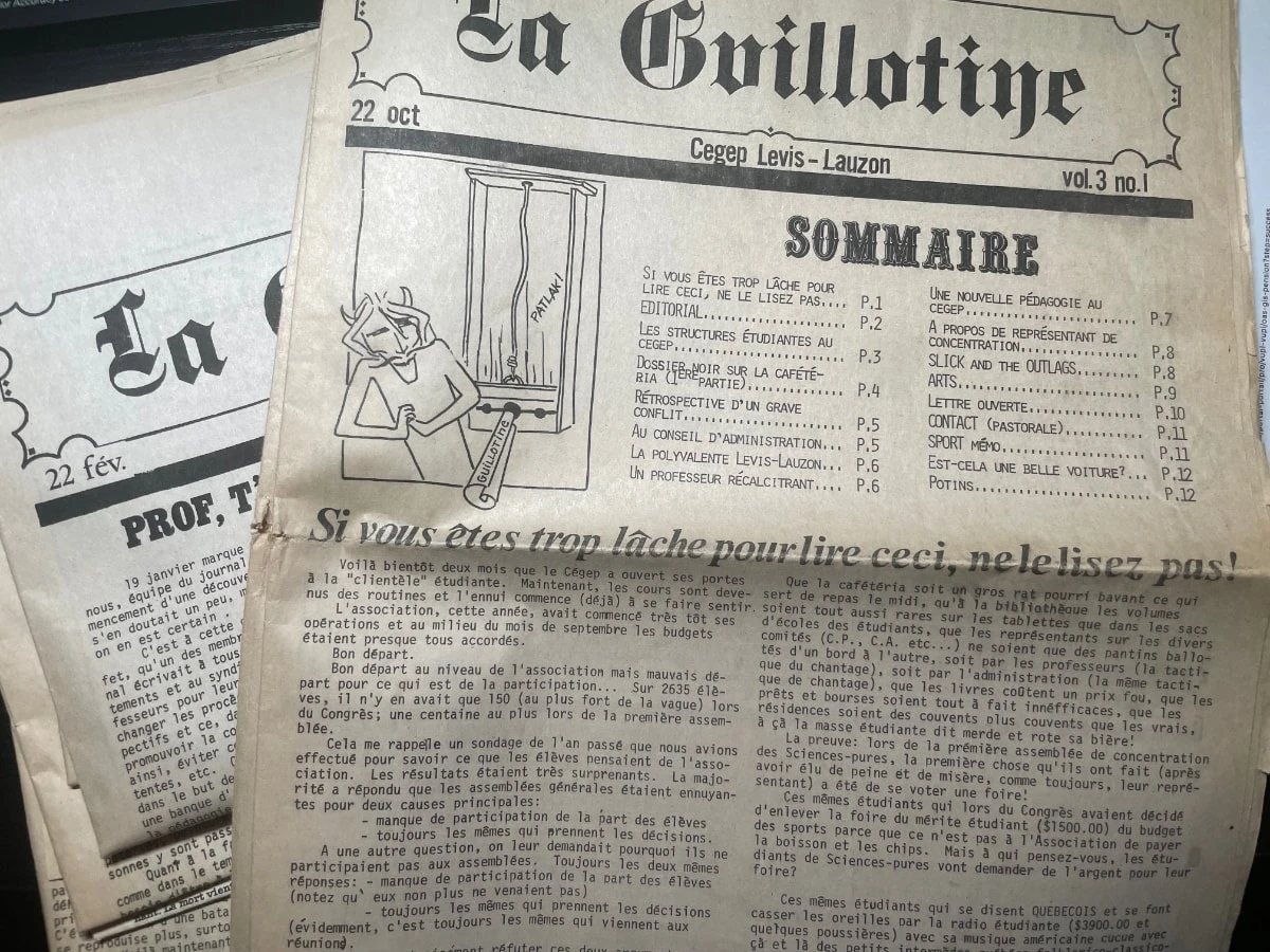 Ma mère m'a remis dernièrement tout ce qu'elle avait conservé de mes écrits, notamment certaines copies du journal étudiant du Cégep Lévis-Lauzon La Guillotine de 1977.