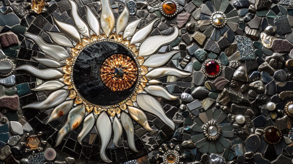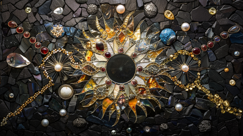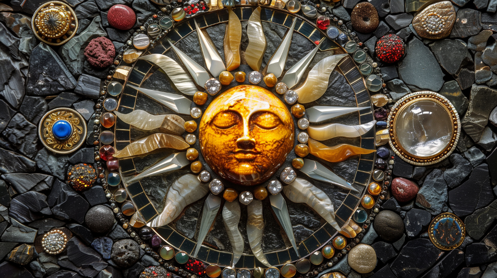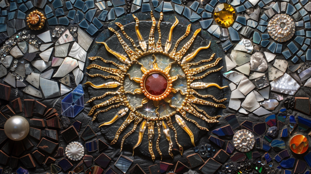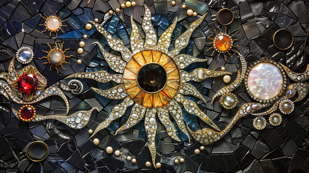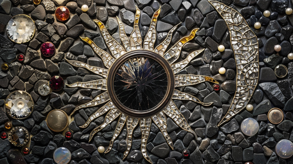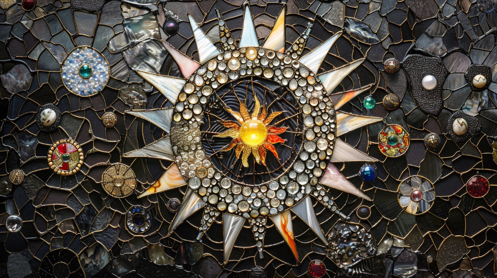 Je cherche toujours ma lumière, mon astre. J'ai demandé à Midjourney de me concocter des soleils en vitrail, puis y ai rajouté des pierres précieuses, du basalte. J'avais déjà demandé quelques soleils à la mode Egon Schiele. L'ordinateur fut inventif et j'ai du mal à choisir. Je ne me lasse pas de cet imaginaire démesurément plagiateur. Il me permet de construire mes décors. Moi qui me promenais pour photographier le monde, me voilà à tapisser mes yeux de diamants computés.