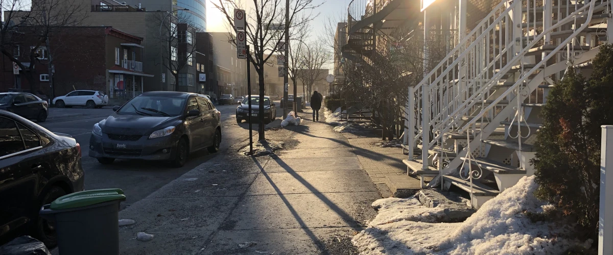 Quand je quitte la maison, mon regard se porte toujours vers le sud qui, de mon balcon, m’apparaît être le nord. Au printemps, la lumière m’accueille. Les longues ombres du matin semblent à la fois figées ou sereines, on ne saurait quoi penser.