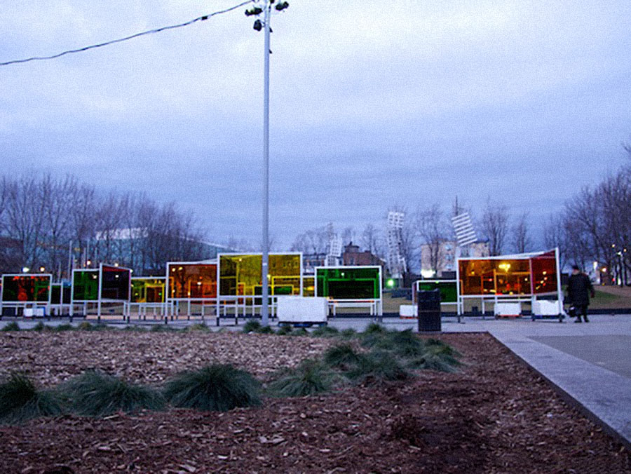 Tout près du Village, au parc Émilie-Gamelin, un labyrinthe coloré a fait son apparition. Je ne sais si l’installation est terminée ou si elle a été conçue ainsi, pur art abstrait se voulant probablement *une rupture avec le paysage quotidien* comme on écrit souvent pour ne rien expliquer.